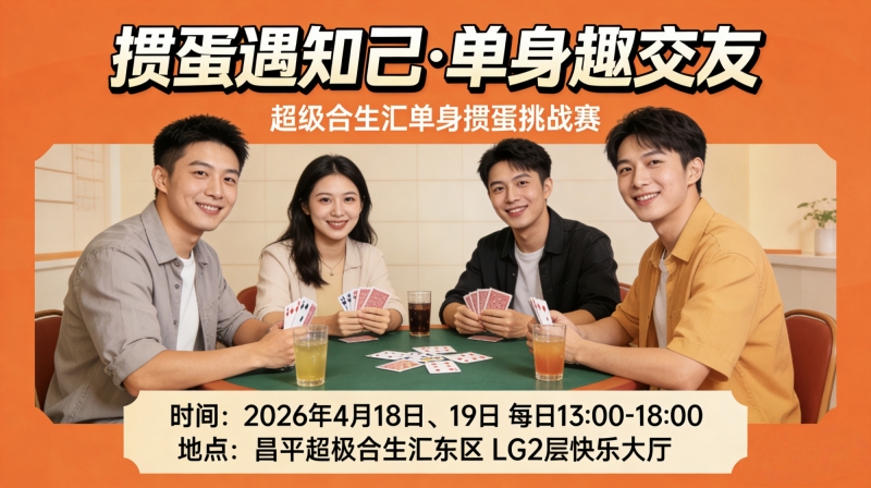 4月18日星期六,超级合生汇快乐大厅等你,掼住缘分,蛋生幸福!