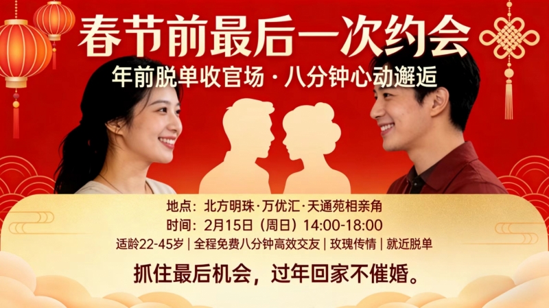 覆盖22-45岁全年龄段优质单身,主打八分钟高效约会,无费用、无套路,只为帮你抓住年末最后一次脱单机会,新年牵手心上人,回家团圆不尴尬~